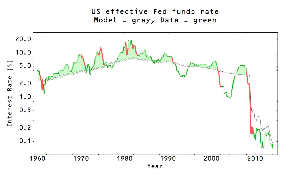 Roger, you might be interested in this. The author's model does tend to confirm that the Austrian Business Cycle Theory (ABCT) does correctly predict that interest rates are an indicator of recessions (red parts of data), HOWEVER, (according to his model), they've got it backwards: high (as in higher than his model's explanation for the effective federal funds rate) tend to precede recessions, not low interest rates.